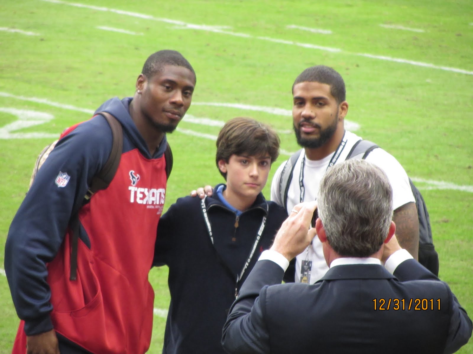These guys (Jacoby Jones WR and Arian Foster RB, for the Houston Texans) were there watching from the Aggie sidelines. I had no clue who they are but everyone was trying to take pictures of them. The best picture I got of them was with this kid (who I don't know).